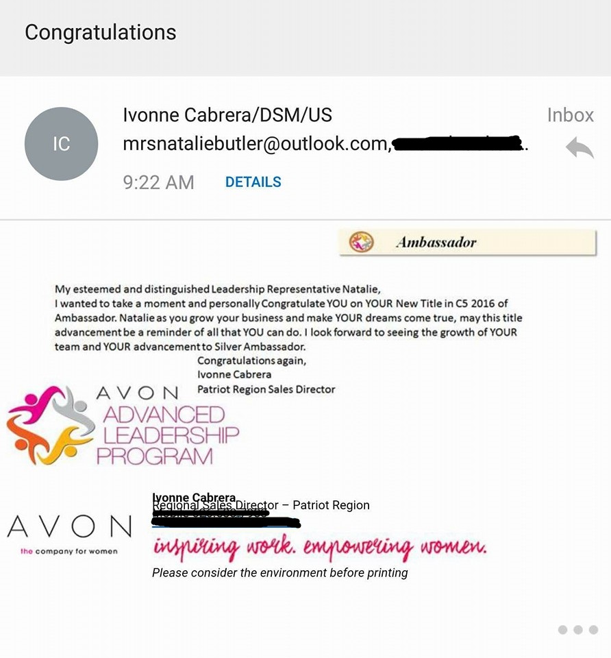 Of course you can! I’d just like to share these quick stats. I’m what they would consider a new representative (length of association: 2-10 campaigns). Campaigns are every 2 weeks. Therefore, there are 26 campaigns as there are 52 weeks in a year. I am the top new representative in my district and I made Ambassador (Leadership status) in 1 campaign (2 weeks). There are recruiting bonuses as well as sales bonuses. For those thinking it is a pyramid scheme, NO! Pyramid schemes mean there is only one way to get paid and that’s by recruiting others. You do not have to do that with Avon. You can either sell, recruit or do both. I chose both because I love both. My grandmother sold Avon so it’s in my blood. I’ve always loved the products and if you do too, then what’s stopping you? Are you worried about what others think of you? Are you afraid of your own success? Or is it because you’re too “busy?”
