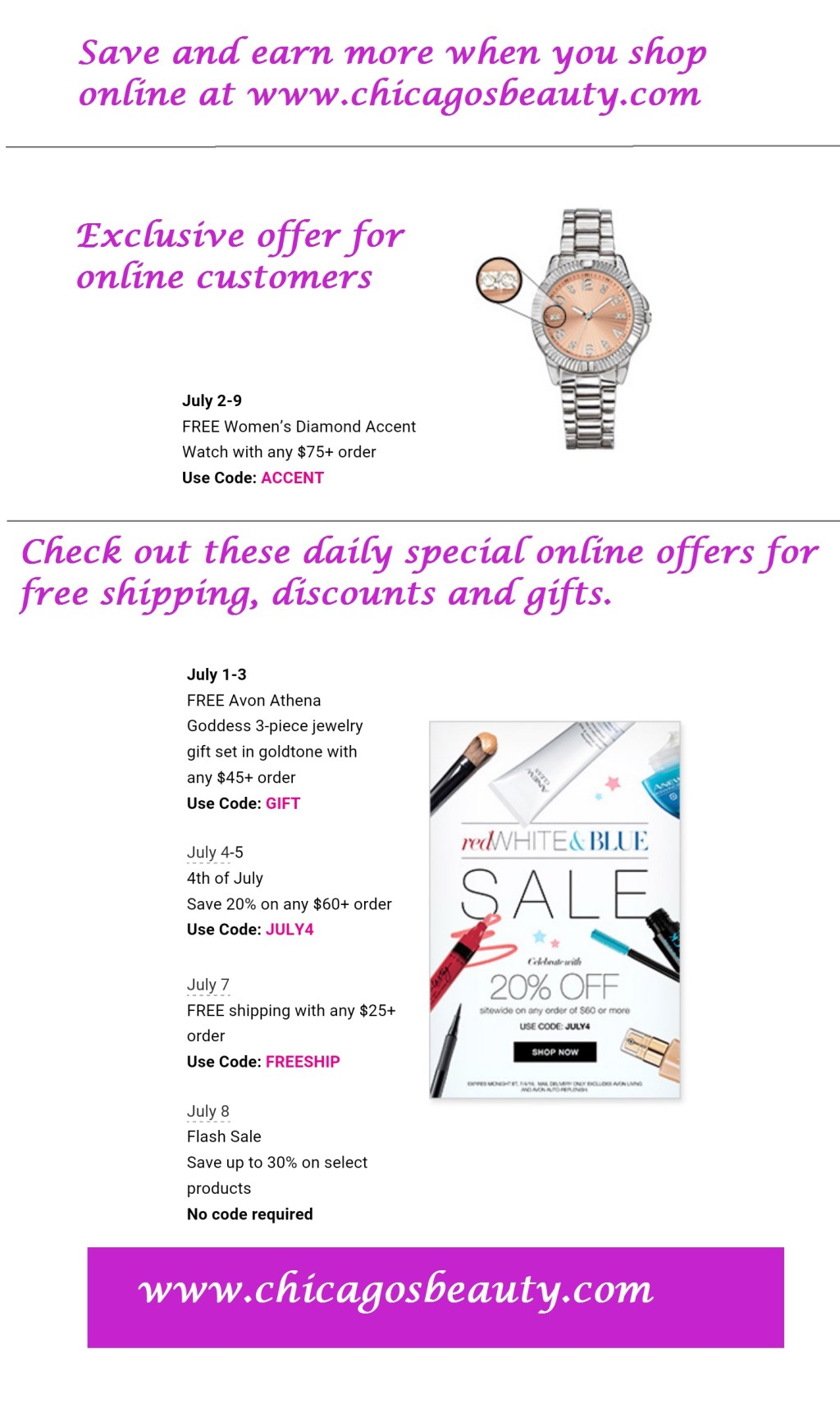 Check out these Avon Coupon Codes for 7/1-7/9. Codes cannot be combined and expire at midnight on the day listed. To redeem, go to my Avon store. If you want more coupon codes, fill out the contact form below to be added to our list.To view online brochures, click here. To begin saving and earning more, click the photo to be taken directly to our online store.