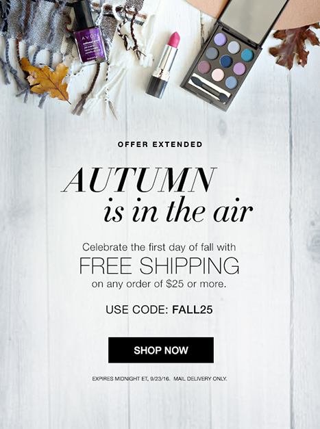 Check out these Avon Coupon Codes for 9/24/16 – 10/1/16. Codes cannot be combined and expire at midnight on the day listed. To redeem, go to my Avon store. If you want more coupon codes, fill out the contact form below to be added to our list. To view online brochures, click here. To begin saving and earning more, click the photo to be taken directly to our online store.