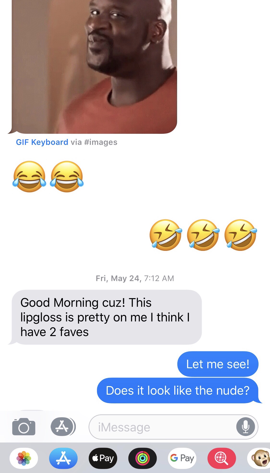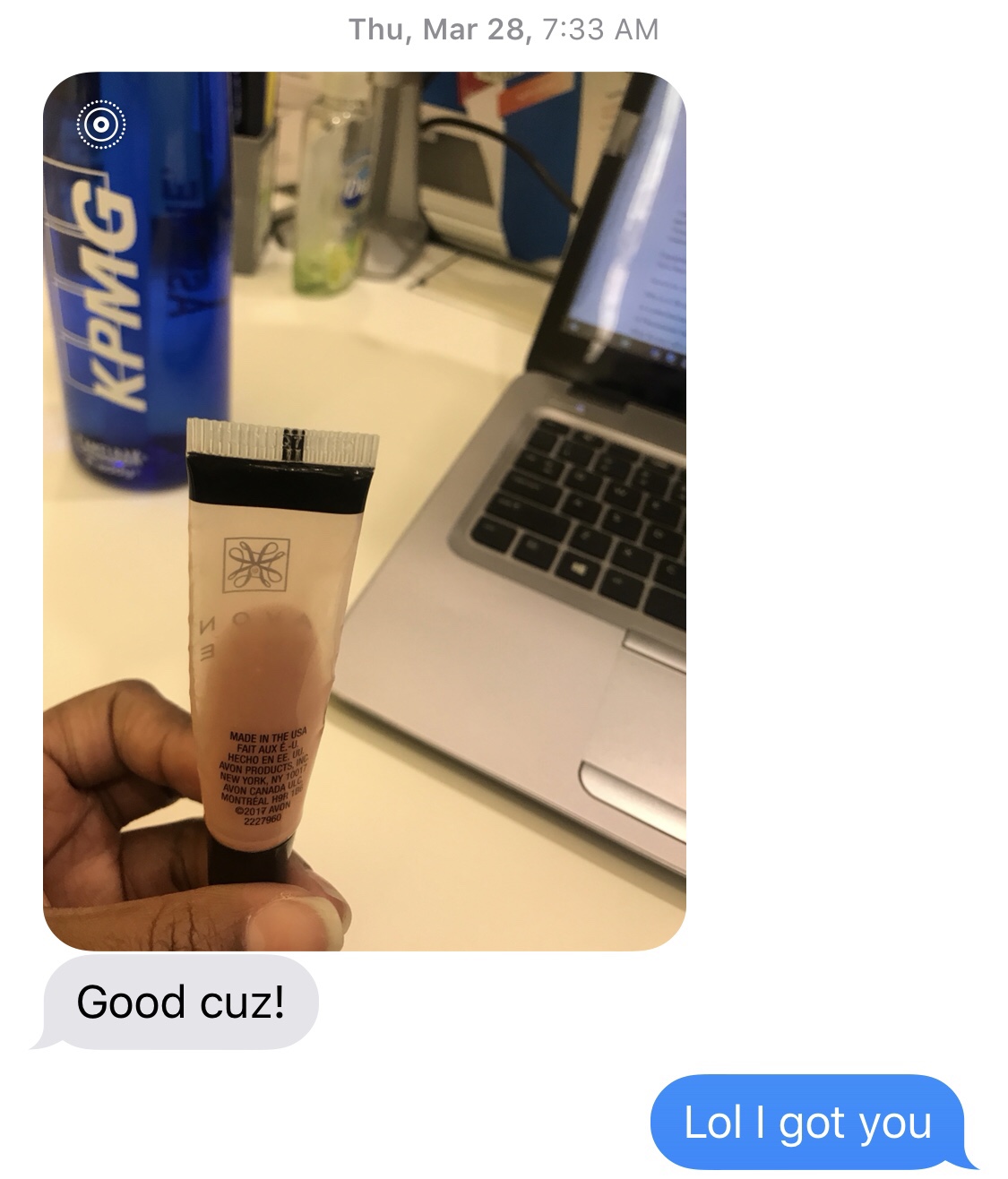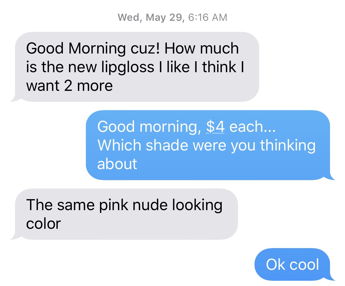 Note: look at the time stamp on the messages. You can see she’s been ordering the same lip gloss for over a year now. Yes, I switched from Android to iPhone in that timeframe.